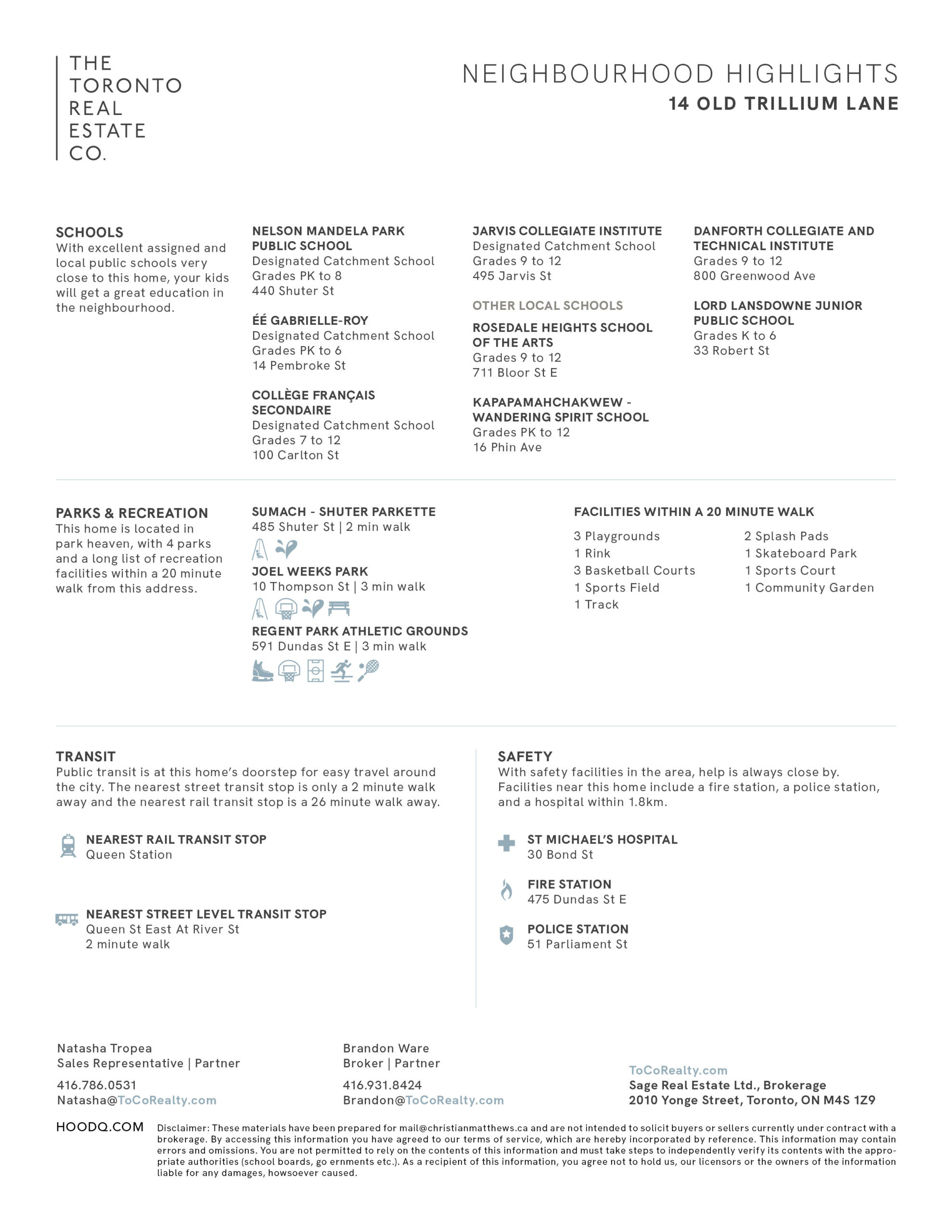 An unbeatable location offering outstanding walkability and connectivity. Steps to King, Queen, Dundas, and Gerrard streetcar lines, and quick access to the DVP. Leslieville’s shops and cafés line nearby Queen East, while Corktown favourites like Sumach Espresso, Forno Cultura, Spaccio, and Impact Kitchen are right around the corner. Close proximity to green spaces such as Corktown Common and Underpass Park, along with family-friendly spots like Sackville Playground and Riverdale Park West.