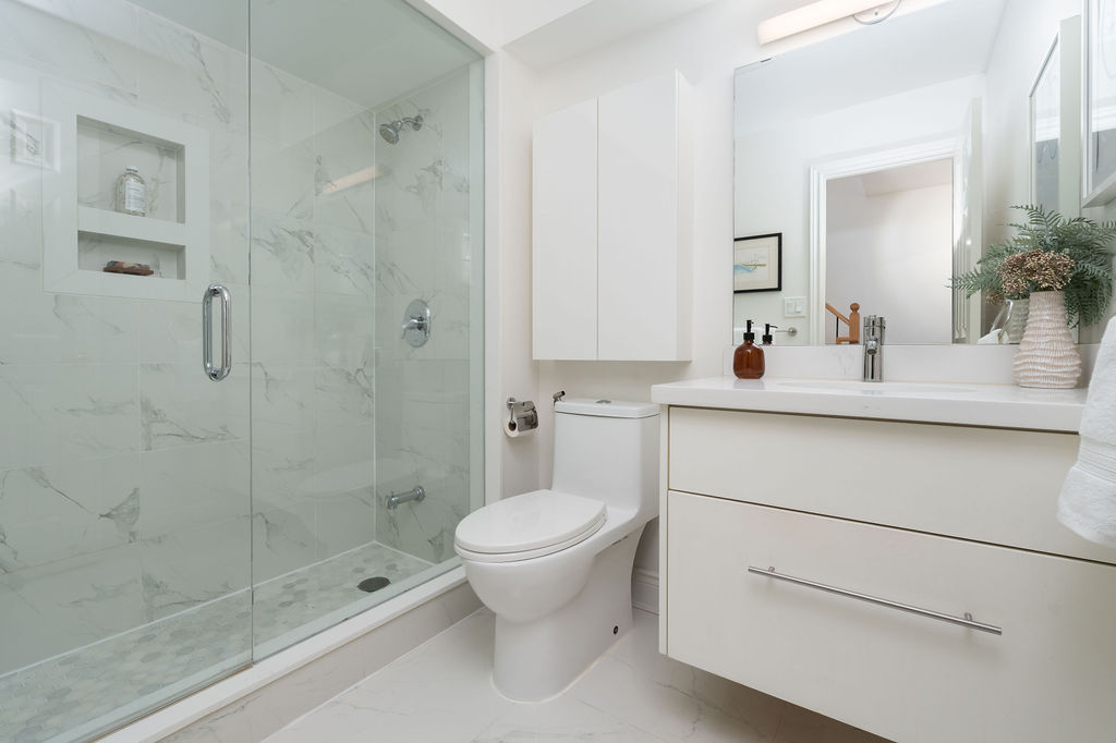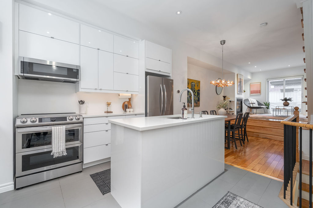 The home features 3 bedrooms, 3 bathrooms and a fully updated modern kitchen with stainless steel appliances, quartz counters, custom millwork, and extended-height cabinetry. The open concept main floor offers nearly 10-ft ceilings in the kitchen and dining area, stepping up to a cozy living room with a gas fireplace, and walkout to a deck complete with a gas line for effortless barbecuing.